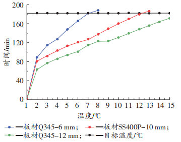 工程機械結(jié)構(gòu)件多數(shù)以厚板件為主,為了確保粉末涂層體系烘干的可實施性,首先對烘干爐設定相同的烘干參數(shù),針對不用的板厚進行升溫曲線測試(如圖1所示),為樣板制作提供技術基礎。