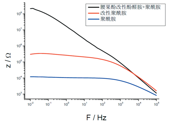 綜合考慮成本和施工性能,環(huán)氧防腐涂料比較常見的固化劑為聚酰胺,其涂層的綜合性能好優(yōu)良,但固化速度慢,現(xiàn)場施工中需要一定的活化期;酚醛胺固化劑固化速度快,固化溫度低,性能優(yōu)異。酚醛胺由酚、甲醛和脂肪胺制備,不同類型的胺可制備出各種酚醛胺固化劑。腰果酚改性酚醛胺固化速度快,柔韌性不如聚酰胺,但鹽霧擴蝕性能明顯好于聚酰胺。綜合考慮,腰果酚改性酚醛胺和聚酰胺混拼使用,所得固化劑固化速度快,綜合性能優(yōu)異。選取實驗室常見的聚酰胺、改性聚酰胺、腰果酚改性酚醛胺作為深海耐溫耐壓涂料固化劑,噴涂樣板后進行模擬深海耐溫耐壓試驗(30 MPa,50 ℃),經(jīng)過30d連續(xù)不間斷試驗,最后進行電化學交流阻抗譜測量。