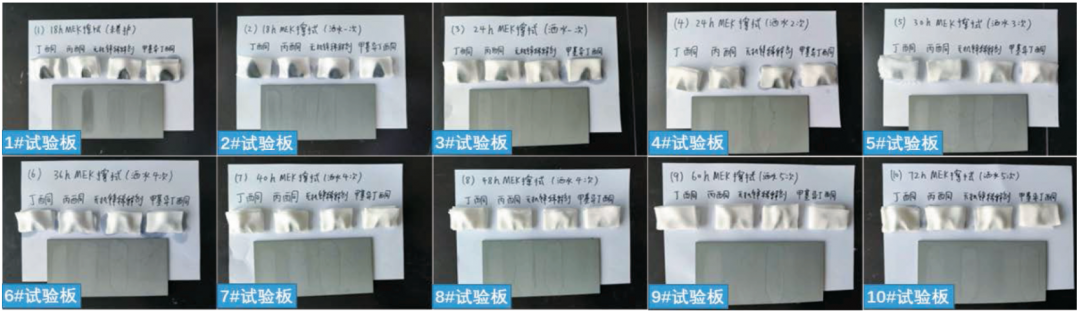 標(biāo)準(zhǔn)的無(wú)機(jī)鋅MEK擦拭試劑應(yīng)為丁酮或丙酮,考慮到該類試劑屬于易制毒品,施工現(xiàn)場(chǎng)較難獲取,檢驗(yàn)人員通常使用其它試劑進(jìn)行擦拭試驗(yàn),而不同試劑的MEK擦拭效果均不相同。本部分實(shí)驗(yàn)通過(guò)控制漆膜養(yǎng)護(hù)條件,模擬出不同MEK擦拭等級(jí)的漆膜表面,分別采用丁酮、丙酮、混合稀釋劑以及甲基異丁酮進(jìn)行MEK擦拭試驗(yàn),比較了不同試劑的MEK擦拭效果。