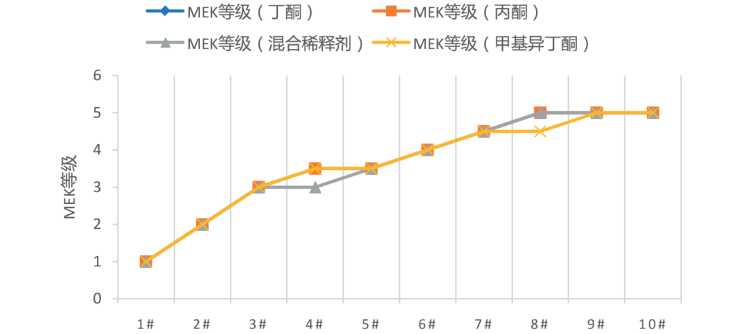 從圖2中可以看出,從1#實(shí)驗(yàn)板到10#實(shí)驗(yàn)板,丁酮、丙酮、混合稀釋劑、甲基異丁酮4種試劑呈現(xiàn)出由深到淺的一致性變化;從圖3 中可以更直觀看出4種試劑的MEK擦拭結(jié)果基本一致,說(shuō)明4種溶劑的擦拭效果基本相同。在丙酮和丁酮較難獲取的情況下,可以用混合稀釋劑(50%異丙醇+35%丙二醇甲醚+15%乙醇)和甲基異丁酮兩種試劑進(jìn)行替代。