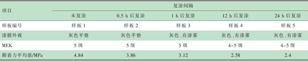 進(jìn)行無(wú)機(jī)富鋅底漆樣板噴涂,噴涂完成后在不同時(shí)間點(diǎn)(0.5h、1h、12h、24h)進(jìn)行復(fù)涂,復(fù)涂厚度30~60μm;對(duì)漆膜充分養(yǎng)護(hù)后進(jìn)行MEK和附著力測(cè)試。