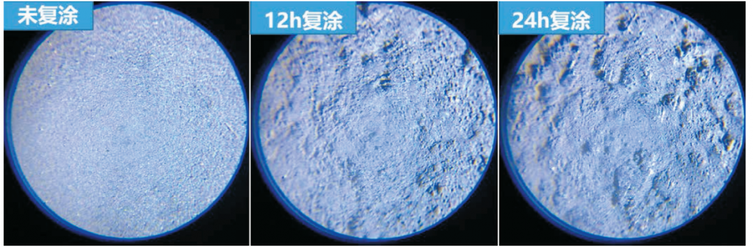 本實(shí)驗(yàn)內(nèi)容主要是針對(duì)施工過(guò)程中對(duì)涂層厚度不滿足要求的施工區(qū)域進(jìn)行復(fù)涂以達(dá)到規(guī)定厚度的操作進(jìn)行的模擬驗(yàn)證,考察漆膜性能是否滿足要求。根據(jù)實(shí)驗(yàn)數(shù)據(jù)(表4),復(fù)涂后無(wú)機(jī)鋅涂層附著力出現(xiàn)了不同程度的下降,0.5h后復(fù)涂涂層附著力下降約20%;當(dāng)復(fù)涂間隔超過(guò)12h后,涂層的附著力數(shù)值下降超過(guò)50%,同時(shí)涂層MEK擦拭也無(wú)法達(dá)到5級(jí)。用100倍放大鏡對(duì)復(fù)涂前后漆膜表面進(jìn)行觀察(圖5),未復(fù)涂的涂層漆膜表面較為平整、光滑,12h、24h后復(fù)涂漆膜表面較為粗糙、凹凸不平,說(shuō)明無(wú)機(jī)鋅漆噴涂時(shí)出現(xiàn)了干噴現(xiàn)象。因此,根據(jù)以上結(jié)果分析,無(wú)機(jī)鋅涂層復(fù)涂后漆膜各項(xiàng)性能均出現(xiàn)了下降。