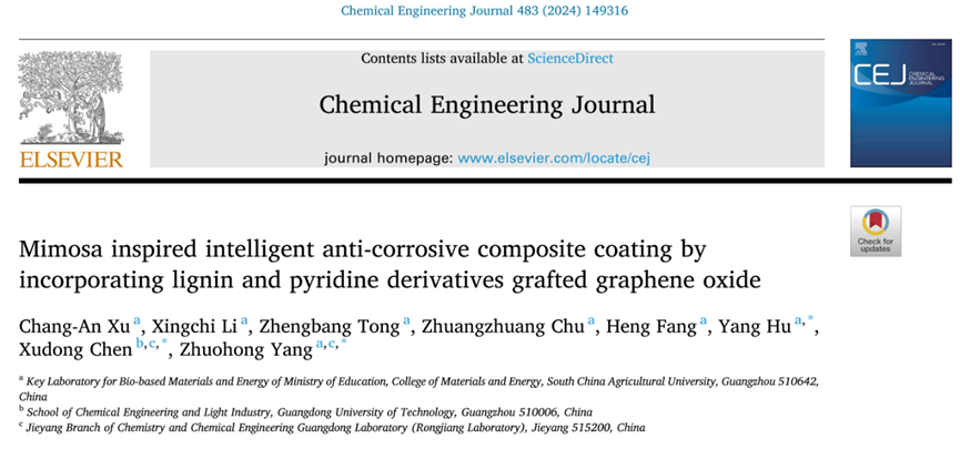 基于此,華南農(nóng)業(yè)大學(xué)材料與能源學(xué)院楊卓鴻教授團(tuán)隊(duì)受含羞草應(yīng)激閉合機(jī)制啟發(fā),以苯乙烯為稀釋劑、環(huán)氧乙烯基酯樹(shù)脂為主體樹(shù)脂、木質(zhì)素和吡啶衍生物改性的氧化石墨烯為填料,采用熱聚合方式制備了對(duì)腐蝕產(chǎn)物亞鐵離子具有常溫響應(yīng)的智能防腐涂層。在此過(guò)程中稀釋劑苯乙烯參與自由基聚合反應(yīng),有效避免了溶劑的揮發(fā),而且制備過(guò)程綠色環(huán)保、無(wú)污染。相關(guān)研究成果已于近日發(fā)表在中科院一區(qū)Top期刊Chemical Engineering Journal上。