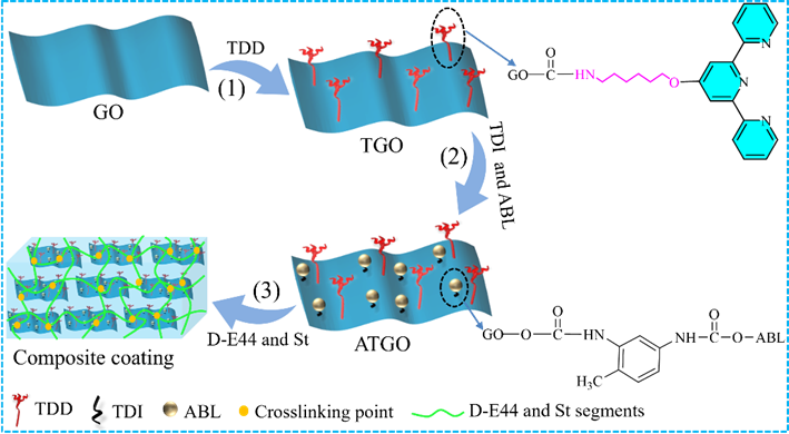 圖2. TDD(1)和ABL(2)對(duì)GO的改性過(guò)程以及復(fù)合涂層的制備(3)