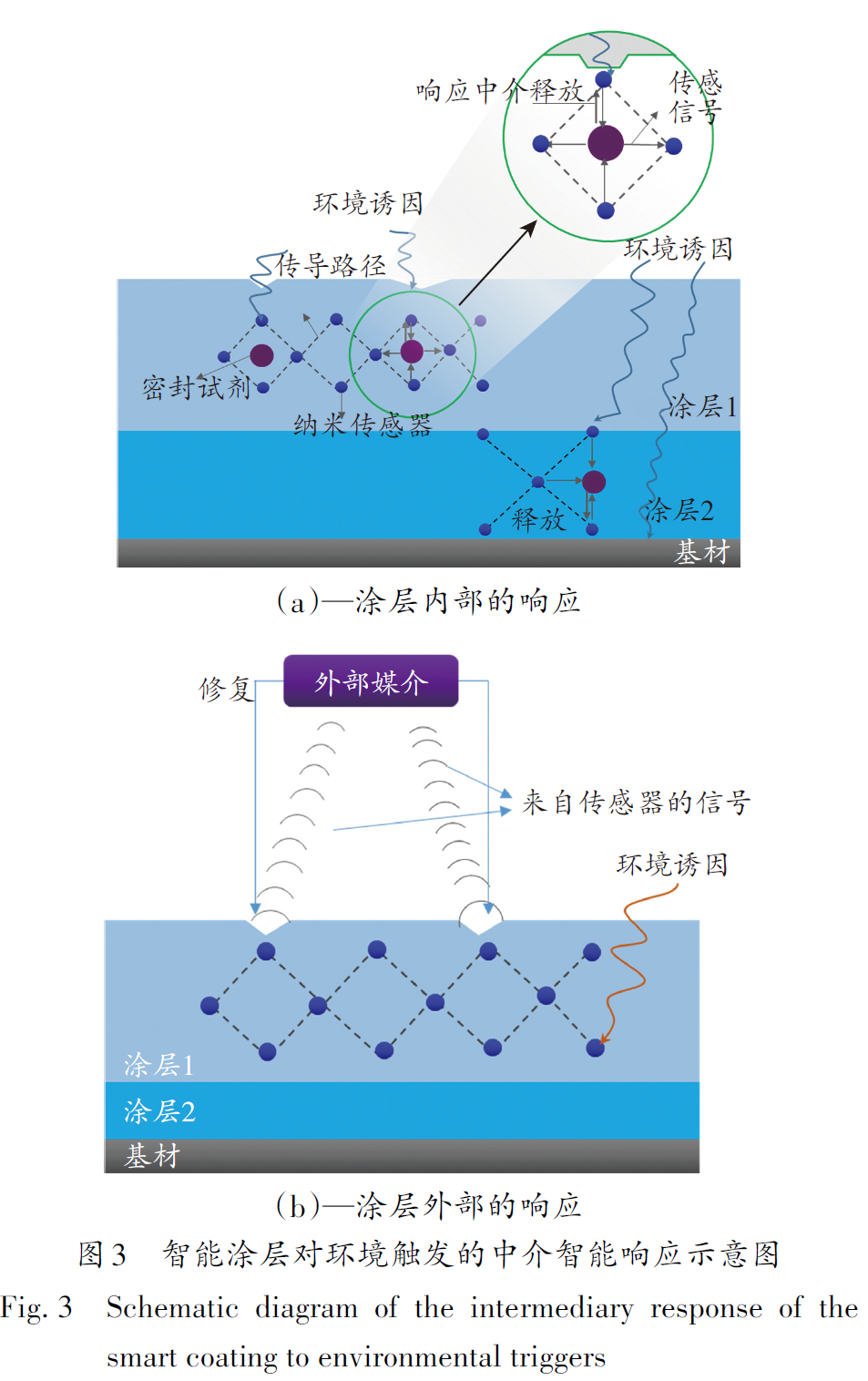 圖3 為中介智能響應(yīng)機(jī)理示意圖。在圖3(a)中,信號通過涂層中的缺陷穿透涂層到達(dá)感知元件,當(dāng)局部區(qū)域的納米傳感器檢測到觸發(fā)因素時(shí),它們可以將信號傳遞給驅(qū)動劑,然后驅(qū)動響應(yīng)。圖3(b)表示響應(yīng)發(fā)生在涂層外部時(shí)的情況,當(dāng)感知元件檢測到觸發(fā)因素時(shí),它們會向外部設(shè)備發(fā)出信號,然后促進(jìn)外部進(jìn)行響應(yīng)。