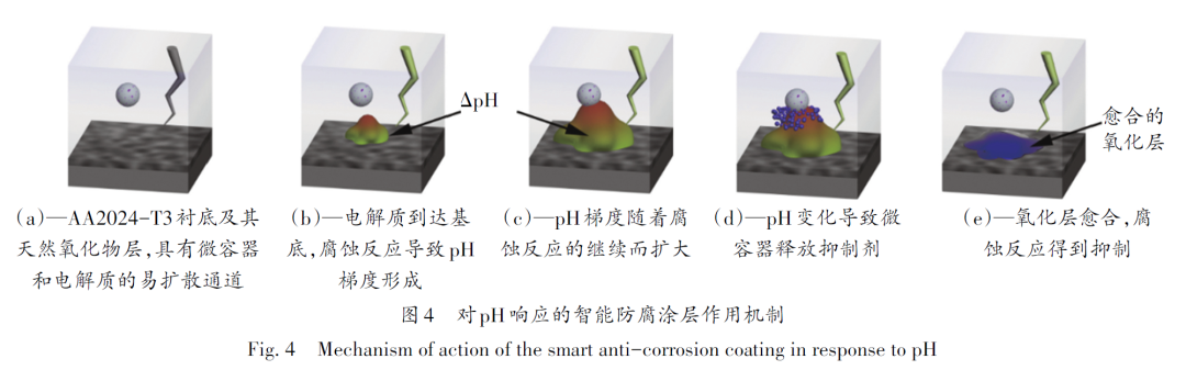 Soleymanibrojeni等以3-氨基?1,2,4-三唑?5-硫醇(ATAT)作為有機(jī)抑制劑,智能微容器為響應(yīng)中介,開發(fā)出AA2024-T3智能防腐涂料,如圖4所示。其中ATAT的傳遞通過負(fù)載ATAT的智能微容器來實(shí)現(xiàn),該智能微容器可以對涂層-基質(zhì)界面處的腐蝕反應(yīng)引起的pH變化作出響應(yīng),當(dāng)pH達(dá)到一定程度時(shí)釋放腐蝕抑制劑ATAT,從而抑制腐蝕反應(yīng)發(fā)生,獲得主動防腐能力。