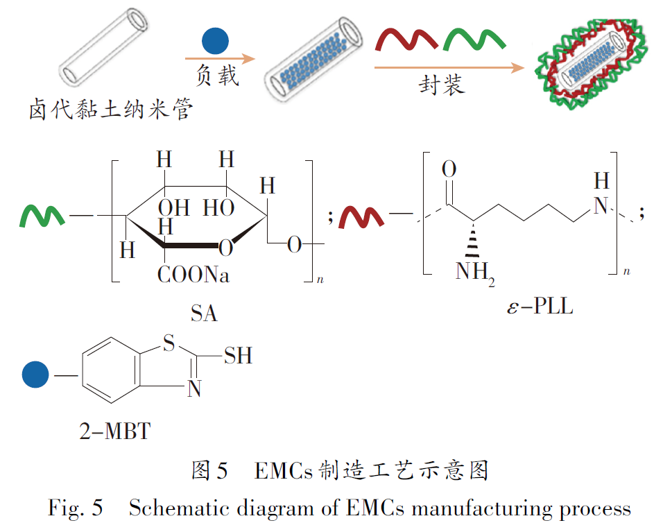 Li等設(shè)計(jì)了一種基于水性聚氨酯涂層的新型環(huán)境友好型腐蝕防護(hù)系統(tǒng)。該系統(tǒng)以2-巰基苯并噻唑(2-MBT)為抑制劑,鹵代黏土納米管(HNTs)為抑制劑載體,并以天然聚電解質(zhì)ε -聚-L-賴氨酸(ε-PLL)和海藻酸鈉(SA)作為逐層封裝(LBL)聚電解質(zhì),制備了對水和pH(7~10)響應(yīng)的智能微膠囊(EMCs)。其中2-MBT從EMCs中釋放是一個(gè)對水和pH敏感的長期過程,且2-MBT的外釋放速率同時(shí)受2-MBT和SA層的溶解度控制。研究發(fā)現(xiàn)2-MBT能夠與腐蝕性介質(zhì)一起轉(zhuǎn)移到涂層/金屬界面,并在陰極區(qū)域釋放更多,具有出色的自修復(fù)性能。這種環(huán)保型聚氨酯不僅為水性聚氨酯涂料提供了理想的自我修復(fù)性能,而且為按需設(shè)計(jì)未來市場的聚氨酯提供了新思路。EMCs制造工藝如圖5所示。
