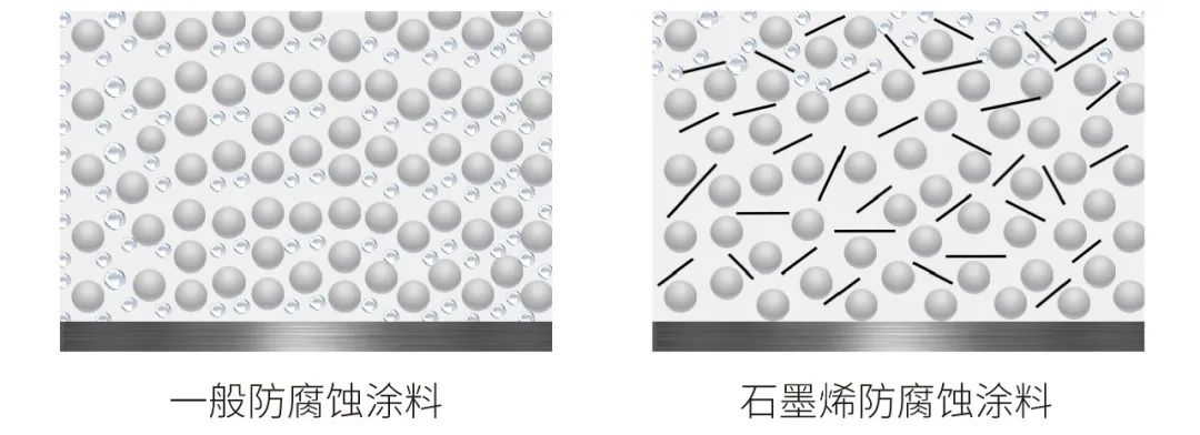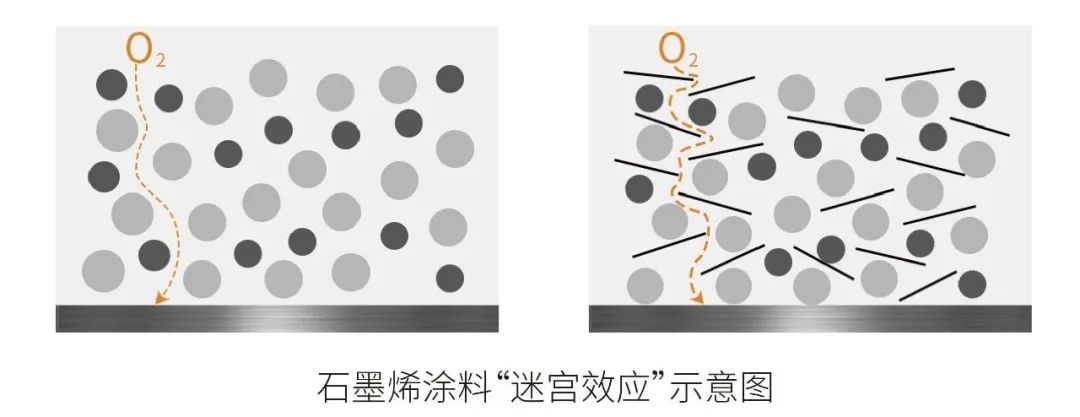 石墨烯涂料利用石墨烯大比表面積和獨特二維結(jié)構(gòu)的覆蓋能力,使其能夠在涂料中層層疊加,有效覆蓋基材,從而形成致密的物理隔絕,對水、氧氣和離子的擴散有很好的物理屏蔽作用,可以增加腐蝕介質(zhì)在涂層中的滲透路程,從而達到對材料的防腐蝕功能。