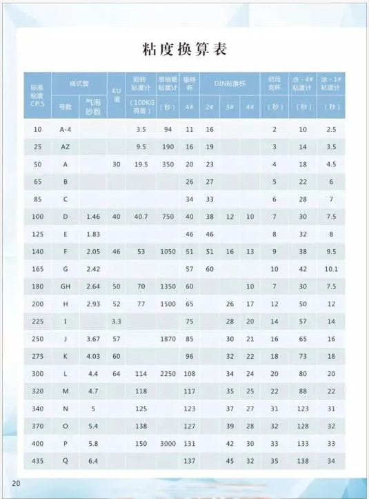 涂-4杯黏度,單位m2/s,=(T4-6.0)/0.223,T4為涂4杯測(cè)得流體流出時(shí)間s;不同黏度測(cè)定方法所得試驗(yàn)數(shù)據(jù)也可通過(guò)表格進(jìn)行換算。(如下圖)