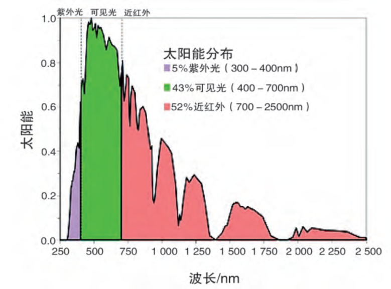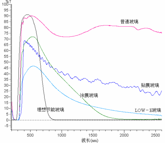 由圖可知,在幾種典型節(jié)能玻璃中,普通玻璃的熱工性能較差,絕大部分的近紅外線能透過玻璃;LOW-E玻璃主要通過反射中、遠(yuǎn)紅外線來達(dá)到隔熱的目的,但可見光透過率損失較多;貼膜玻璃對近紅外線具有較弱的阻隔能力(某些貼膜玻璃具有良好的近紅外線阻隔能力);涂膜玻璃可以有效阻隔近紅外線的透射,同時可見光透射率較高,不足的是,絕大多數(shù)涂膜玻璃對近紅外線的阻隔是通過吸收來實現(xiàn)的;理想的節(jié)能玻璃應(yīng)是幾乎隔絕近紅外線,而對可見光透射比沒有影響。
