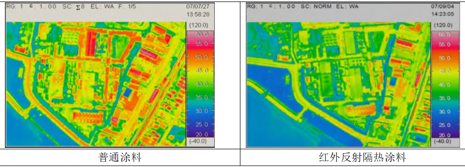 紅外反射隔熱涂料[12]是一種具有巨大發(fā)展?jié)摿Φ男滦凸δ芡苛稀=┠?,社會對其的?yīng)用需求迅速增長。根據(jù)我國《節(jié)約能源法》規(guī)定,研發(fā)的紅外反射隔熱涂料具有裝飾和隔熱的雙重功能,相應(yīng)的產(chǎn)品標(biāo)準(zhǔn)已經(jīng)出臺,如:JC/T 1040-2007《建筑外表面用熱反射隔熱涂料》、GB/T 25261-2010《建筑用反射隔熱涂料》和JG/T 235-2014《建筑反射隔熱涂料》。通過理論計算和分析,與普通涂層相比,使用反射隔熱涂層可提高節(jié)能效率15.9%,節(jié)能效果明顯。紅外反射隔熱涂料已被用于諸多領(lǐng)域,如石油化工、糧食儲備和建筑工程屋面及墻面等。實際應(yīng)用有明顯效果,如圖2所示。