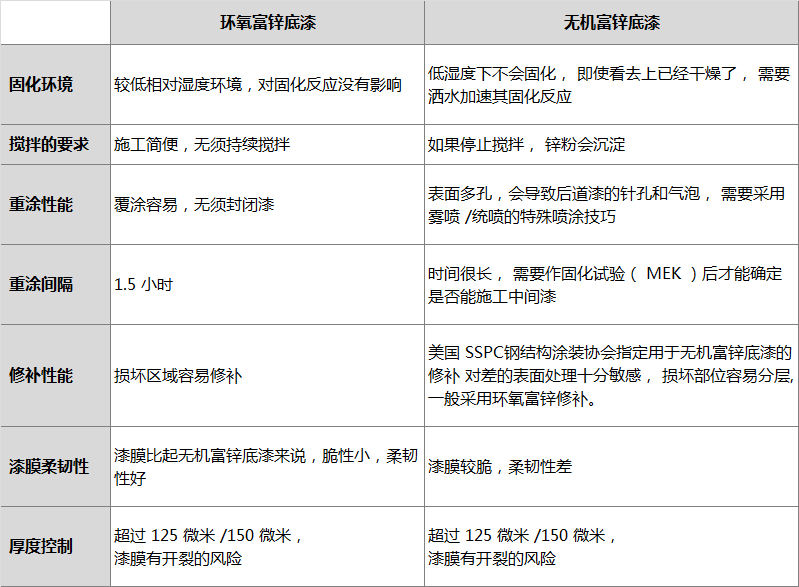 無(wú)機(jī)富鋅漆在耐熱和耐溶劑、耐化學(xué)品性能以及導(dǎo)靜電方面優(yōu)于環(huán)氧富鋅漆,但是漆膜的柔韌性和施工性能較差。無(wú)機(jī)富鋅漆在施工時(shí)有一些特殊的要求,比如其固化要依靠較高的相對(duì)濕度,表面多 孔性要求進(jìn)行霧噴技術(shù)等,而環(huán)氧富鋅漆的施工要求相比之下簡(jiǎn)單得多。