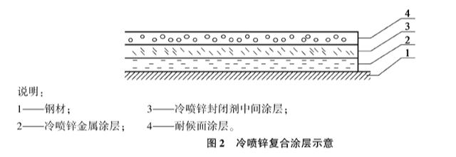 冷噴鋅復(fù)合涂層體系由冷噴鋅金屬涂層、冷噴鋅封閉劑中間涂層和耐候面涂層組成,示意見(jiàn)圖2。