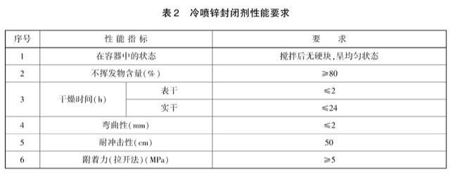 冷噴鋅封閉劑性能要求應(yīng)符合表2 的規(guī)定。