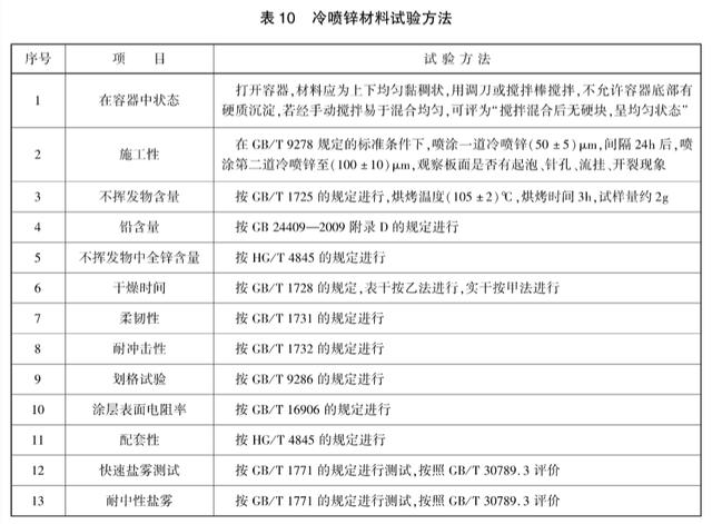 冷噴鋅材料試驗(yàn)方法見(jiàn)表10。