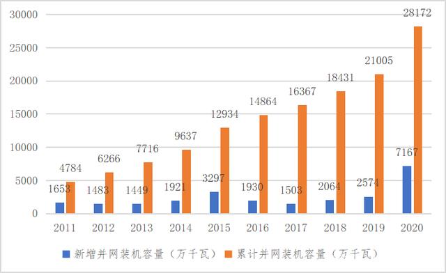 圖1:2011-2020年我國風電新增并網(wǎng)裝機容量及累計并網(wǎng)裝機容量(單位:萬千瓦)
