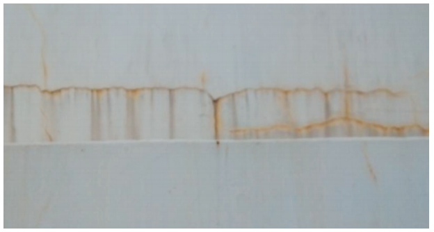混凝土儲罐長時間服役后會發(fā)生不同程度開裂,見圖2。隨著混凝土裂紋的增長,涂層材料可能會產(chǎn)生裂紋,導(dǎo)致涂層體系失效。目前,LNG儲罐主要應(yīng)用“環(huán)氧底漆+環(huán)氧云鐵中間漆+脂肪族聚氨酯面漆”方案,該配套體系,經(jīng)濟(jì)性好,技術(shù)及施工成熟度高。但該配套體系壽命一般為3~5 a,維修成本高,且柔韌性一般,斷裂伸長率低。