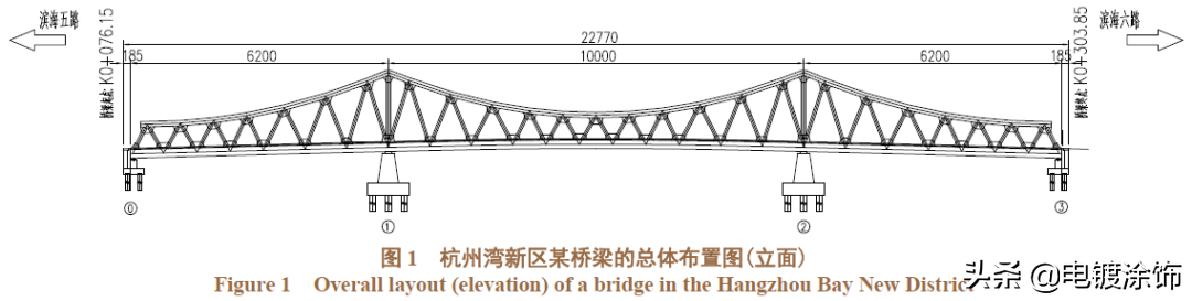 位于浙江杭州灣新區(qū)(該地區(qū)為典型的海洋大氣環(huán)境,腐蝕環(huán)境類別為C5-M)的某大橋?yàn)槿邕B續(xù)鋼桁梁橋,長(zhǎng)227.7 m,寬41.5 m,其橋型總體布置立面圖如圖1所示。橫斷面采用兩片主桁布置,主桁中心間距25.8 m。主體結(jié)構(gòu)采用Q345D鋼,栓焊結(jié)合。