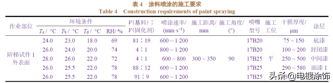 選取涂有車(chē)間底漆(醇溶性無(wú)機(jī)硅酸鋅)的試板(厚度為14 mm),漆膜厚度選用上限,即25 μm。施工前,通過(guò)試驗(yàn)確認(rèn)表面處理及噴涂的工藝參數(shù),為后續(xù)施工及批量涂裝生產(chǎn)提供有效的技術(shù)依據(jù)。
