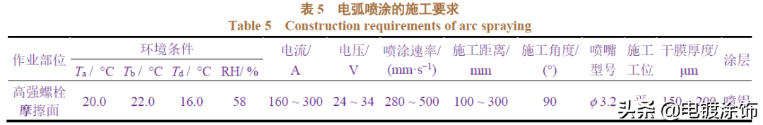 采用十字噴涂法進(jìn)行電弧噴鋁,通過(guò)調(diào)節(jié)施工參數(shù)來(lái)做到鋁層顆粒細(xì)小,以降低鋁層的孔隙率。摩擦面涂裝范圍從孔群最外側(cè)螺栓孔壁外延80 mm,要做到摩擦面、噴涂面規(guī)整,無(wú)波浪邊。