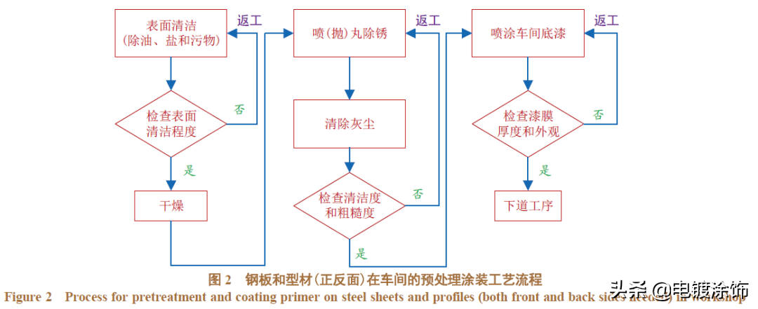 表面清理包括對(duì)表面缺陷進(jìn)行修補(bǔ)、打磨,以及清除鋼板表面的氧化皮、油污、可溶鹽等。工藝流程為:焊接缺陷補(bǔ)焊→打磨→用清洗劑清洗油污→吹凈→干燥。