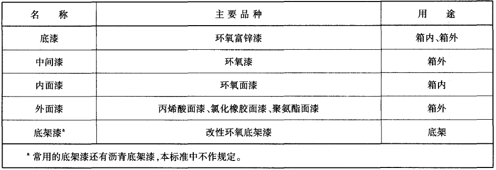 集裝箱涂料按其功能和用途,分為底漆、中間漆、內(nèi)面漆、外面漆和底架漆等,主要品種見表1。