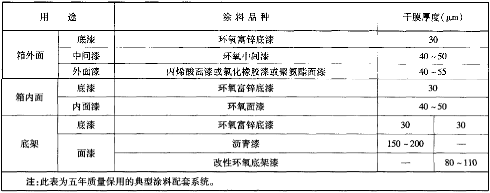 集裝箱底架一般采用兩層涂膜的涂裝配套,底漆為環(huán)氧富鋅底漆,面漆可選用改性環(huán)氧底架漆或?yàn)r青漆等。典型涂料配套見表。