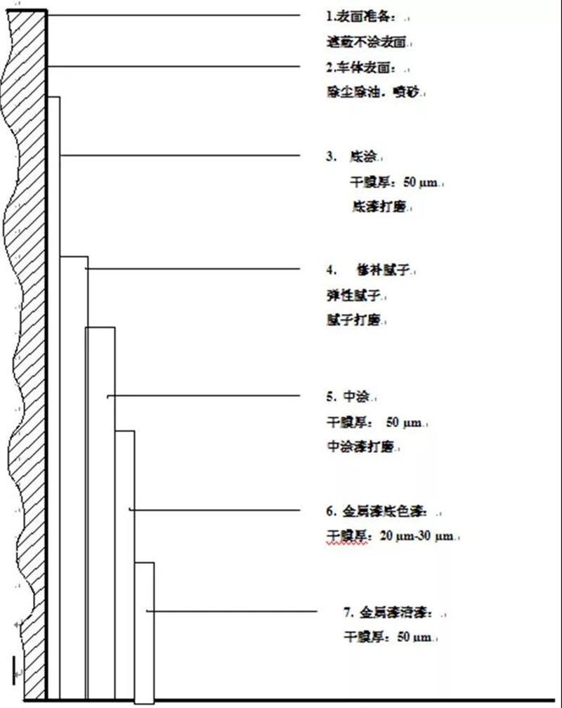 打磨底漆層后,按質(zhì)量比100:2(基料:固化劑)配制水性聚酯膩子,涂刮3~4遍。膩子干燥后,經(jīng)打磨后的車體表面應(yīng)無刀痕、針孔等缺陷,控制膩子膜厚不超過3 mm。