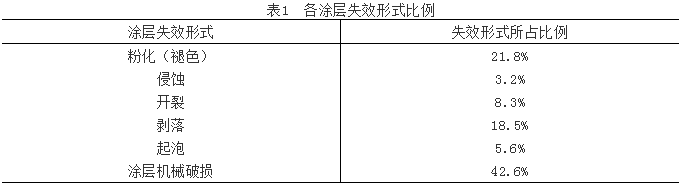 石油鉆采設(shè)備主要的服役環(huán)境有三大類,即沙漠干旱環(huán)境、陸地大氣環(huán)境和海洋潮濕環(huán)境。經(jīng)過多年統(tǒng)計(jì),石油鉆采設(shè)備備在服役期間主要發(fā)生的涂層失效類型有粉化、侵蝕、開裂、剝落、起泡、涂層機(jī)械破損(磕傷、劃傷)等六類,涂層失效形式所占比如表1中所示。
