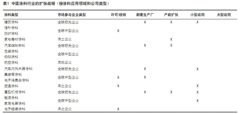 這兩個(gè)地區(qū)涂料市場(chǎng)也存在很多不同之處。首先,歐洲涂料市場(chǎng)發(fā)展成熟,未來增長(zhǎng)機(jī)會(huì)有限。相反,中國(guó)涂料市場(chǎng)處于發(fā)展壯大階段,過去幾十年里,其年增長(zhǎng)率約為18%。特別指出,中國(guó)整個(gè)消費(fèi)品市場(chǎng)的增長(zhǎng)速度遠(yuǎn)遠(yuǎn)高于任何其他地區(qū),因此,中國(guó)成為全球涂料應(yīng)用的中心,例如船舶涂料、集裝箱涂料以及電子消費(fèi)品涂料和家用電器涂料。第二大顯著區(qū)別在于中國(guó)市場(chǎng)的參與者為本土企業(yè)。實(shí)際上,有三部分涂料生產(chǎn)企業(yè)參與中國(guó)涂料市場(chǎng)的競(jìng)爭(zhēng),其中不僅包括領(lǐng)先的全球企業(yè)和國(guó)際中型企業(yè),還包括中國(guó)的本土企業(yè)。為了獲取中國(guó)市場(chǎng)的占有率,這三部分競(jìng)爭(zhēng)對(duì)手根據(jù)領(lǐng)域特點(diǎn),采取不同的策略和方式(表1)。