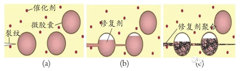 White等設(shè)計了典型的微膠囊自修復(fù)復(fù)合材料系統(tǒng),具體設(shè)計思路如圖1所示。