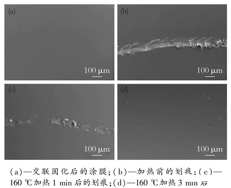 有較多的研究是將熱塑性聚乙烯甲基丙烯酸酯共聚物作為彈性體制備自修復(fù)涂料。彈性體自修復(fù)過程如圖4所示。從圖4可以看出,當(dāng)涂膜遭到撞擊發(fā)生破裂后,彈性體受熱可重新恢復(fù)原來形狀。