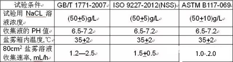 在關(guān)于中性鹽霧試驗(yàn)上來看,這三個(gè)標(biāo)準(zhǔn)規(guī)定的試驗(yàn)條件是只有細(xì)微差別而基本一致的。