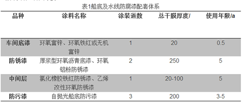 由于船底及水線區(qū)域涂層長期受海水的浸泡、流水的沖擊、干濕交替、陰極剝離作用,并且要求與防污涂料之間有良好的層間附著力,所以傳統(tǒng)的單組分氯化橡膠鋁粉厚涂底漆、瀝青防腐鋁粉底漆因防腐效果差,逐漸被雙組分環(huán)氧防腐涂料所取代,目前以環(huán)氧鋁粉厚漿涂料、環(huán)氧厚漿瀝青防腐涂料為主,如國內(nèi)的HZ-1、HZ-2環(huán)氧煤瀝青等船底防腐涂料產(chǎn)品,但隨著船東要求涂料的防腐期效越來越長,涂料應(yīng)有良好的通用性,以及煤焦瀝青的致癌嫌疑等原因,環(huán)氧煤瀝青涂料逐步被純環(huán)氧涂料所取代。環(huán)保法規(guī)的日趨嚴(yán)格,美國海軍對防腐涂料的VOC要求低于400g/L,一些高溶劑含量涂料也將被高固體分環(huán)氧涂料取代,另外船廠和船東也要求減少施工程序、減少涂料品種、降低前處理費(fèi)用、減少施工道數(shù),因此目前船底防腐涂料的發(fā)展方向是低表面處理適應(yīng)性、高固體、通用性、長效防腐、快干。目前國內(nèi)的船底及水線防腐漆配套體系見表1。