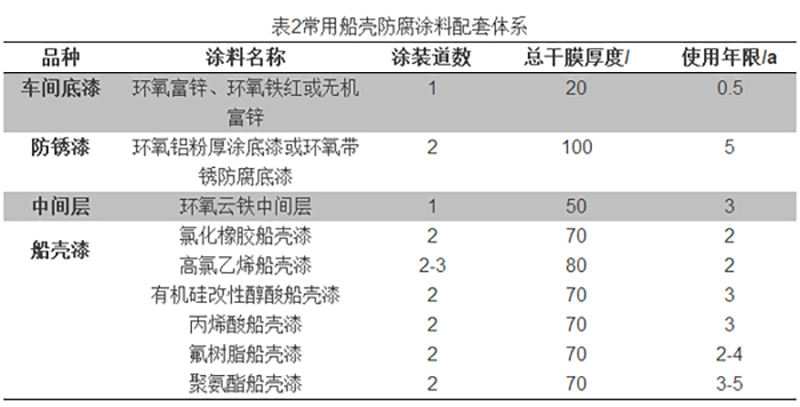 該區(qū)域涂料主要受海水、霧、海風(fēng)的侵蝕,氣溫變化、日光照射的影響,從而加速漆膜的失光、粉化,甚至開裂脫落,目前主要以三涂層體系為主,底漆有環(huán)氧富鋅底漆、無機(jī)富鋅底漆、水性無機(jī)富鋅底漆、環(huán)氧磷化底漆、磷化底漆;中間層為環(huán)氧云鐵防腐涂料、無涂裝間隔的改性環(huán)氧涂料;耐候面漆有有機(jī)硅改性醇酸、氯化橡膠、單組分丙烯酸、可復(fù)涂丙烯酸聚氨酯、氟碳涂料。依據(jù)不同的防腐年限,采用不同的配套涂料體系,一些配套涂料體系經(jīng)實(shí)船試驗(yàn)有10a以上的防腐期效。目前國外的發(fā)展趨勢為長效、環(huán)保、施工道數(shù)少、采用二涂層體系代替?zhèn)鹘y(tǒng)的三涂層體系,如美國PSX系列雜化硅環(huán)氧、雜化硅丙烯酸系列,目前各大型艦船涂料制備公司都開始推出相應(yīng)的產(chǎn)品。此類涂料可減少施工道數(shù)、降低施工過程中的溶劑揮發(fā)、有更高的耐候性,涂料的綜合性價(jià)比較三涂層丙烯酸聚氨酯體系有較大的優(yōu)勢。目前的傳統(tǒng)三涂層配套體系見表2。