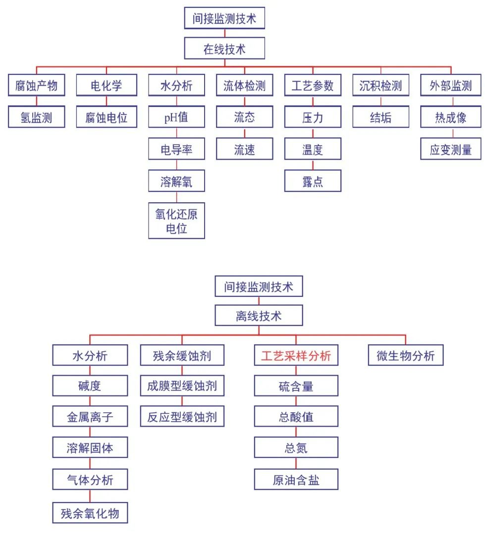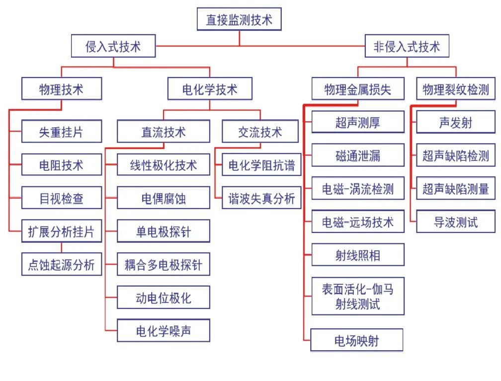根據(jù)腐蝕監(jiān)測(cè)技術(shù)特征,可以分為直接監(jiān)測(cè)技術(shù)和間接監(jiān)測(cè)技術(shù),直接監(jiān)測(cè)技術(shù)測(cè)量的是因腐蝕或沖蝕而出現(xiàn)直接變化的參數(shù);而間接監(jiān)測(cè)技術(shù)測(cè)量的是那些影響腐蝕或沖蝕,或受腐蝕或沖蝕影響而出現(xiàn)變化的參數(shù)。其中直接監(jiān)測(cè)技術(shù)又分為侵入式技術(shù)和非侵入式技術(shù)兩類(lèi),間接監(jiān)測(cè)技術(shù)分為在線(xiàn)技術(shù)和離線(xiàn)技術(shù)兩類(lèi)。侵入式技術(shù)是指需要穿過(guò)管線(xiàn)或容器外壁,直接接觸到內(nèi)部介質(zhì)進(jìn)行測(cè)量的技術(shù),一般來(lái)說(shuō),侵入式技術(shù)需要特定形式的探針或測(cè)試片;間接監(jiān)測(cè)技術(shù)可以是在線(xiàn)或離線(xiàn)的,對(duì)于在線(xiàn)技術(shù)而言,不需要將設(shè)備從工藝過(guò)程中移除,而離線(xiàn)技術(shù)則需要從工藝過(guò)程中采集樣品或試片進(jìn)行分析。根據(jù)以上分類(lèi),對(duì)目前存在的腐蝕監(jiān)測(cè)技術(shù)進(jìn)行分類(lèi)劃分,形成技術(shù)體系,分別如圖1、2所示。