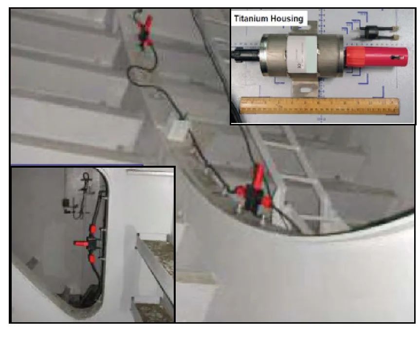 目前,金屬結(jié)構(gòu)在海洋中服役時(shí),以電化學(xué)腐蝕和沖刷腐蝕為主,相應(yīng)的腐蝕監(jiān)測(cè)技術(shù)也與這兩種腐蝕行為相匹配。以船舶為例,相關(guān)資料顯示,美國(guó)艦船的鋼制壓載水艙內(nèi)部廣泛應(yīng)用了腐蝕電位監(jiān)測(cè)裝置,通過(guò)腐蝕電位的監(jiān)測(cè)來(lái)判斷壓載艙內(nèi)部涂層破損情況及陰極保護(hù)系統(tǒng)的工作情況。應(yīng)用情況如圖3所示,其中,參比電極采用Ag/AgCl電極,通過(guò)數(shù)據(jù)采集將不同部位的腐蝕電位分布情況進(jìn)行系統(tǒng)分析,當(dāng)局部涂層破損時(shí),破損部位的腐蝕電位較完好部位的腐蝕電位會(huì)有所下降,可以通過(guò)腐蝕電位的變化定性判斷涂層體系的使用情況。此外,腐蝕電位監(jiān)測(cè)也可以對(duì)壓載艙內(nèi)部的犧牲陽(yáng)極陰極保護(hù)系統(tǒng)的工作情況進(jìn)行判別,當(dāng)犧牲陽(yáng)極達(dá)到消耗下限或局部布置不合理時(shí),相應(yīng)的保護(hù)電位會(huì)教標(biāo)準(zhǔn)電位有所差別,通過(guò)該差值判斷陰極保護(hù)系統(tǒng)的工作情況。