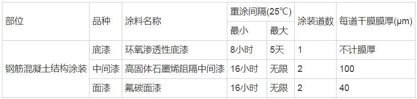(2)對鋼筋混凝土基材進行全面檢查,對已經(jīng)老化的混凝土表面進行機械打磨,刮膩子找平后進行涂料涂裝。嚴格按照基材前處理—報檢—底漆施工—報檢中間漆施工—報檢—面漆施工—最終驗收的工序,嚴格記錄每道施工情況,發(fā)現(xiàn)有厚度不足及時予以修補,發(fā)現(xiàn)附著力不達標,及時鏟除重新進行涂裝。