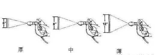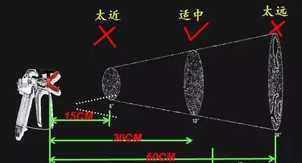 噴槍與需噴涂表面的距離要保持12英寸遠(大約30厘米),水平和豎直方向都應對準需噴涂表面。選擇較大噴嘴時,需要加大噴槍與需噴涂表面的距離。在噴涂過程中,要確保噴槍與需噴涂表面時刻保持水平,如果噴槍與需噴涂表面產生角度,噴涂效果將會產生明顯不均衡的厚度。