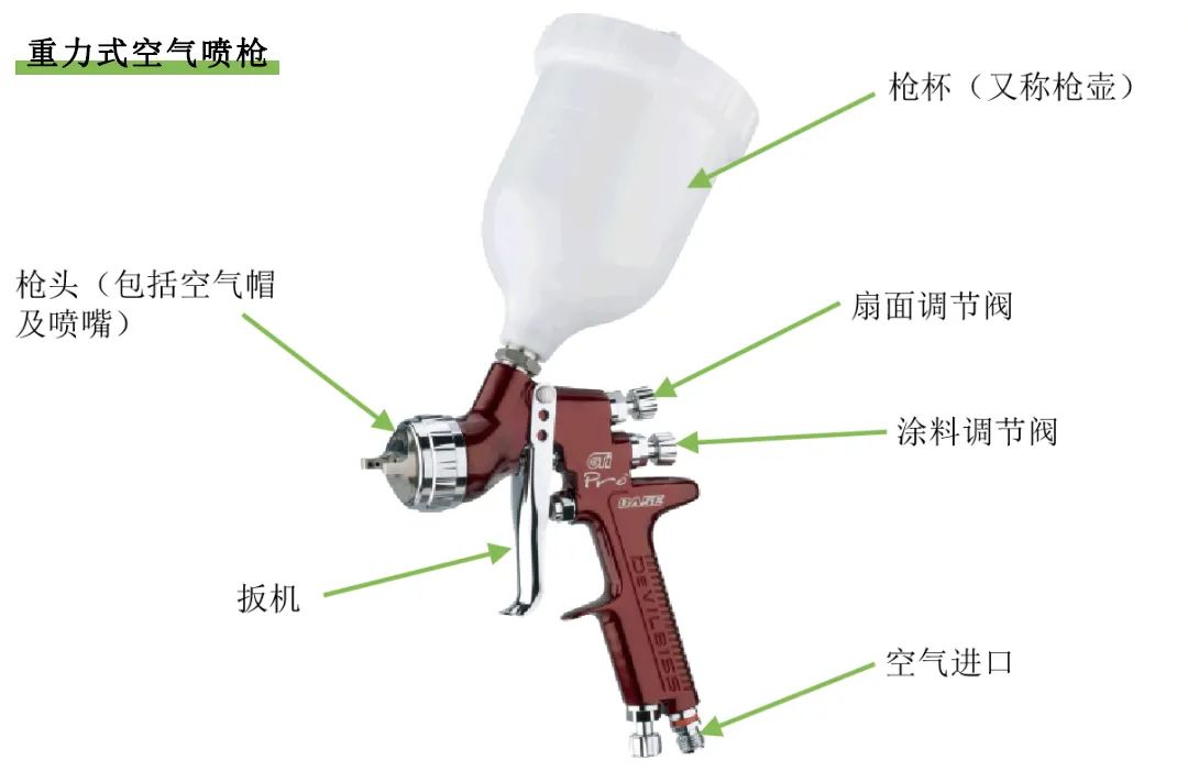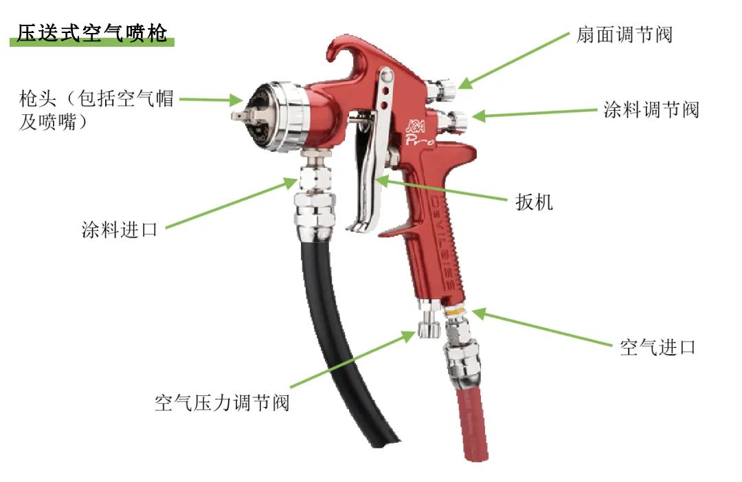 空氣噴槍按照進料方式的不同分為重力式噴槍、虹吸式噴槍與壓送式噴槍。重力式空氣噴槍,通常用于小面積修補或涂料用量少與換色頻繁的噴涂作業(yè)場合。虹吸式進料噴槍一般用于大面積但非連續(xù)性的噴涂作業(yè)場合。壓送式噴槍適用于涂料連續(xù)噴涂的作業(yè)場合。