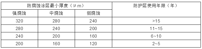 根據(jù)《工業(yè)建筑防腐蝕設(shè)計標(biāo)準(zhǔn)》GB/T 50046-2018第3.3.3條,防護(hù)層的設(shè)計使用年限應(yīng)符合下列規(guī)定: