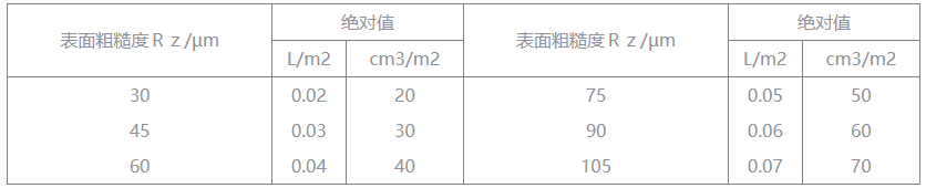 一定的粗糙度對于所需要用來填平表面輪廓的涂料量基本上是一定的,通常這個數(shù)值被稱為“絕對值”(Dead Volume)。根據(jù)試驗(yàn)和計算,不同的表面粗糙度與其所要求相應(yīng)的涂料填充量如下圖,這里的涂料量不考慮噴涂帶來的損耗。