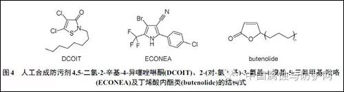 為解決天然產(chǎn)物防污劑在生物體中含量較低、提取工藝復(fù)雜、低產(chǎn)率等問題,通過從自然界生物中提取具有較好防污活性的物質(zhì),研究其結(jié)構(gòu)與防污效果的關(guān)系,找到防污活性官能團(tuán),再進(jìn)一步人工合成此類防污活性化合物或其結(jié)構(gòu)類似物,是環(huán)境友好防污劑研究中的一條重要途徑(圖4)。例如目前新出現(xiàn)的綠色防污劑2-(對(duì)-氯苯基)-3-氰基-4-溴基-5-三氟甲基-吡咯(ECONEA)就是通過對(duì)微生物鏈霉菌(streptomyces fumanus)的代謝產(chǎn)物(dioxapyrrolomycin)結(jié)構(gòu)仿生制備;目前廣泛使用的4,5-二氯-2-辛基-4-異噻唑啉酮(DCOIT),其異噻唑啉酮結(jié)構(gòu)是由一種生物防污劑的結(jié)構(gòu)改造而來;香港科技大學(xué)錢培元教授課題組開發(fā)的丁烯酸內(nèi)酯類(butenolide)防污劑是通過對(duì)海洋鏈霉菌代謝物的化學(xué)結(jié)構(gòu)改造而來。該類防污劑在海洋中半衰期短、易降解,釋放于海水后能很快分解或降解為無毒化合物,不在生物體內(nèi)產(chǎn)生積累。需要說明的是,該類防污劑在海洋工程化應(yīng)用之前,還有很多技術(shù)難題需要克服。例如:如何解決該防污劑與涂料樹脂的相容性和可控釋放性,實(shí)現(xiàn)低含量有效等等。海洋防污材料的方向是發(fā)展高效、環(huán)境友好、多功能性材料。使用無毒、環(huán)境友好防污劑也是未來發(fā)展的重要方向。將環(huán)境友好高分子(如生物降解高分子)與環(huán)境友好防污劑結(jié)合,形成一種多功能的海洋防污體系是最佳途徑。