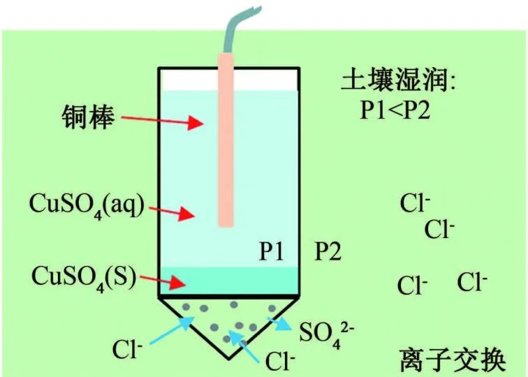在干旱土壤中,長效參比電極失效機制如圖2(a)所示,電極內(nèi)的滲透壓遠高于土壤滲透壓,電解液滲出壓力最大。隨著長效參比電極內(nèi)電解液的不斷滲出,銅棒露出甚至懸空,出現(xiàn)氧化、電極和電解液分離等問題,導致長效參比電極電位漂移或發(fā)生失效。在濕潤土壤環(huán)境中,長效參比電極失效機制如圖2(b)所示,與常規(guī)土壤溶液不同,鹽漬土土壤溶液中Cl-等可溶性離子含量高,在濃度差驅(qū)動下,Cl-等離子會滲透進入電極,改變了原Cu-CuSO4電極體系,參比電極電位發(fā)生漂移。