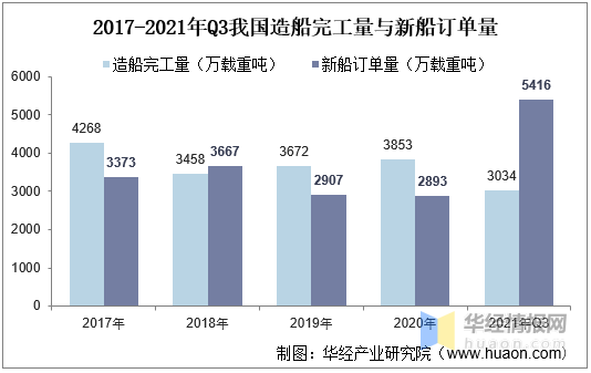 據(jù)統(tǒng)計(jì),2017-2020年我國(guó)造船完工量與新船訂單量呈波動(dòng)下降趨勢(shì),2020年我國(guó)造船完工量為3853萬(wàn)載重噸,同比增長(zhǎng)4.9%,新船訂單量為2893萬(wàn)載重噸,同比下降0.5%。截至2021年前三季度我國(guó)造船完工量為3034萬(wàn)載重噸,同比增長(zhǎng)6.2%,新船訂單量為5416萬(wàn)載重噸,同比增長(zhǎng)223%。