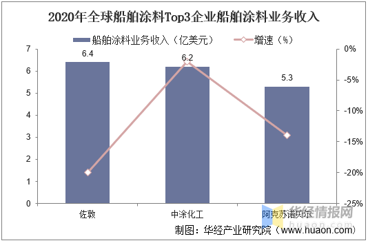 據(jù)統(tǒng)計(jì),2020年全球佐敦以6.42億美元銷售收入位居榜首,市占率達(dá)到16.1%;中涂化工以6.2億美元銷售收入排名第二,阿克蘇諾貝爾則以5.3億美元銷售收入位居第三,其余海虹老人、PPG、金剛化工、立邦涂料、宣偉、關(guān)西涂料、立帕麥位于第4到第10位,行業(yè)CR5達(dá)69.9%,CR10高達(dá)92.3%,市場(chǎng)集中度較高。從全球Top3船舶涂料企業(yè)營(yíng)收對(duì)比來(lái)看,2020年佐敦、中涂化工、阿克蘇諾貝爾三家企業(yè)船舶涂料業(yè)務(wù)收入均出現(xiàn)不同程度的下降,其中龍頭企業(yè)佐敦船舶涂料業(yè)務(wù)收入同比下降達(dá)20%。