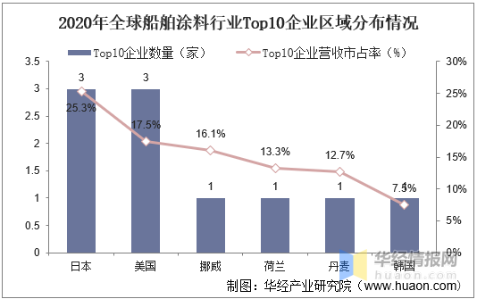 從全球船舶涂料行業(yè)Top10企業(yè)地區(qū)分布來(lái)看,2020年美國(guó)與日本分別占據(jù)3家企業(yè),日本上榜三家企業(yè)市占率合計(jì)25.3%,美國(guó)上榜三家企業(yè)市占率合計(jì)17.5%。其余4家企業(yè)分別位于挪威、荷蘭、丹麥與韓國(guó),市占率分別為16.1%、13.3%、12.7%與7.5%。
