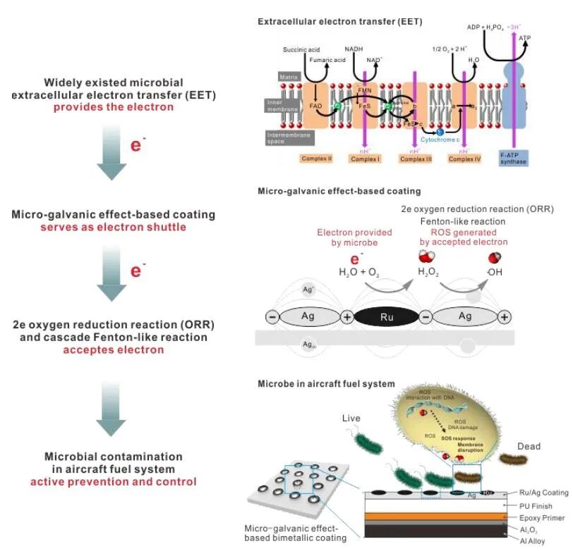 主動釋放活性氧和胞外電子傳遞聯(lián)用的“主動持續(xù)”金屬微電池抗菌涂層的構(gòu)筑。西北 工業(yè)大學(xué)戚震輝課題組[53]報(bào)道了一種由雙金屬微電極體系構(gòu)成的可在油水界面自催化的新型材料(WFA,圖 1)。該種材料在水介質(zhì)中通過串聯(lián)二電子氧還原反應(yīng)(2e ORR)和類 芬頓反應(yīng)(Fenton-like reaction)生成殺菌物質(zhì)雙氧水 H2O2和其他活性氧物質(zhì) ROS。選擇貴 金屬銀(Ag)和過渡金屬釕(Ru)構(gòu)筑雙金屬(Ag-Ru)微電極體系的模型。銀離子具有 良好的殺菌活性,經(jīng)過特定處理[54]后,可以與鈀、釕、鉑等金屬形成微電池催化微區(qū)。通 過電化學(xué)實(shí)驗(yàn)和 H2O2與其他 ROS 的檢測,驗(yàn)證了串聯(lián)反應(yīng)的存在和可行性。并在無自然光 照射下,WFA 銀-釕雙金屬顆粒微電極在 2 h 內(nèi)對飛機(jī)燃油系統(tǒng)內(nèi)常見菌(如大腸桿菌、銅 綠假單胞菌、枯草芽孢桿菌和硫酸鹽還原菌[55]等)的消毒效率均大于 99.9999%。ROS 猝滅 實(shí)驗(yàn)和 Ag +電感耦合等離子體質(zhì)譜(ICP-MS)結(jié)果表明,H2O2和·O2-是其廣譜活性和高效殺 菌性能的主要作用物質(zhì)。同時(shí),WFA 雙金屬微電極體系可以在飛機(jī)燃油系統(tǒng)無光黑暗條件 下進(jìn)行高效殺菌?;诮饘匐x子的特性,雙金屬體系可以很容易地通過電化學(xué)沉積的方法涂 覆在不同形狀的金屬表面,如不銹鋼。同時(shí),燃油微生物與微電池涂層表面接觸時(shí)有明顯的 電流產(chǎn)生;當(dāng)使用死的菌與涂層作用時(shí),電流強(qiáng)度明顯減弱、ROS 釋放現(xiàn)象基本消失。因 此,微生物胞外電子傳遞是揭示燃油系統(tǒng)微生物在微電池涂層表面主動殺除機(jī)制的關(guān)鍵突破 口。該雙金屬微電極殺菌體系利用水作為介質(zhì),同時(shí)適用于燃油體系黑暗條件,可為高效非 化學(xué)自催化殺菌材料的開發(fā)提供新的思路。