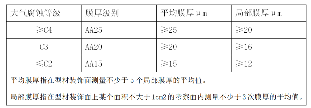 (3)氧化膜膜厚級別不應(yīng)小于 AA15。對于大氣污染條件惡的環(huán)境或需要耐磨時,氧化膜膜厚級別應(yīng)選用AA20、AA25。陽極氧化平均膜厚、局部膜應(yīng)符合表5的規(guī)定: