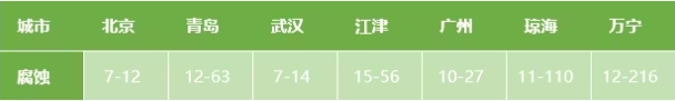 由上表可見,海洋大氣環(huán)境的腐蝕遠大于內(nèi)陸環(huán)境,南方潮濕環(huán)境大于北方干燥環(huán)境。試驗驗證了大氣腐蝕破壞的本質(zhì)和速率是由表面薄電解質(zhì)液膜成分和性質(zhì)決定的,普遍認為大氣腐蝕的因素中濕度(濕潤時間)、SO2和氯化物污染水平最為關(guān)鍵。